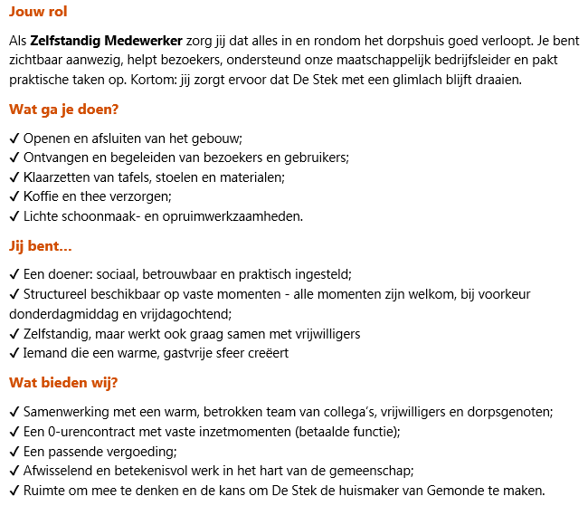 Zorg dat alles in en rond het dorpshuis soepel verloopt tijdens vaste momenten door de week, betaald o.b.v. een 0-urencontract.